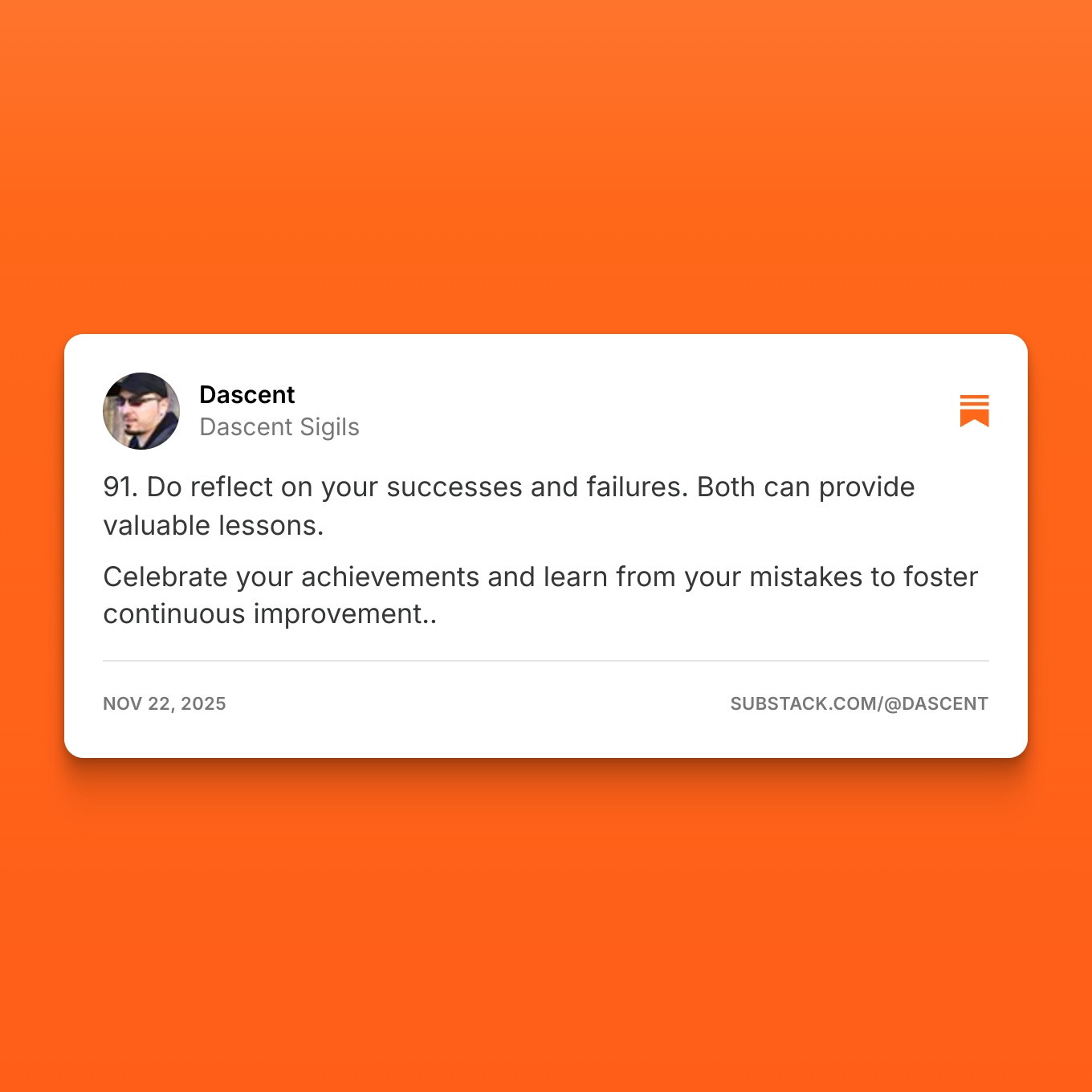 Dascent PerspectiveQuote 91๐ก Do reflect on your successes and failures. Both can provide valuable lessons.DascentNov 29, 2025Share91. Do reflect on your successes and failures. Both can provide valuable lessons.Celebrate your achievements and learn from your mistakes to foster continuous improvement.Thanks for reading Dascent Sigils! This post is public so feel free to share it.SharePreviousNext